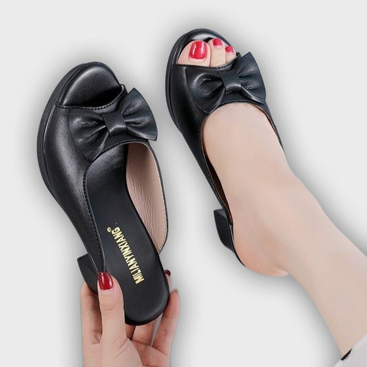 Women’s Chunky Heel Sandals – Faux Leather Open Toe with Bow Accent