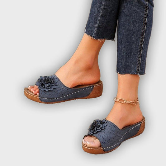 Noelle Women’s Wedge Sandals – Perforated Upper – Floral Accent – Open Toe