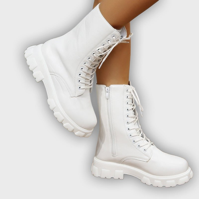 was looking for something easy to wear, edgy enough for city days, and still comfortable for real life – and *Elara* delivers on all fronts. These mid-calf boots combine a chunky sole that cushions every step with an adjustable lace-up front that keeps the fit snug and secure. The smooth faux leather adds a polished touch, while the side zip makes slipping in and out effortless. What I love most? They’re tough without being bulky. I wear them with skinny jeans and an oversized jumper when I'm on the move – or pair them with a skirt and tights to switch it up for evenings. They’re the kind of boots that look like you’ve made an effort, even when you haven’t. Durable, practical, and just bold enough – that’s *Elara*.