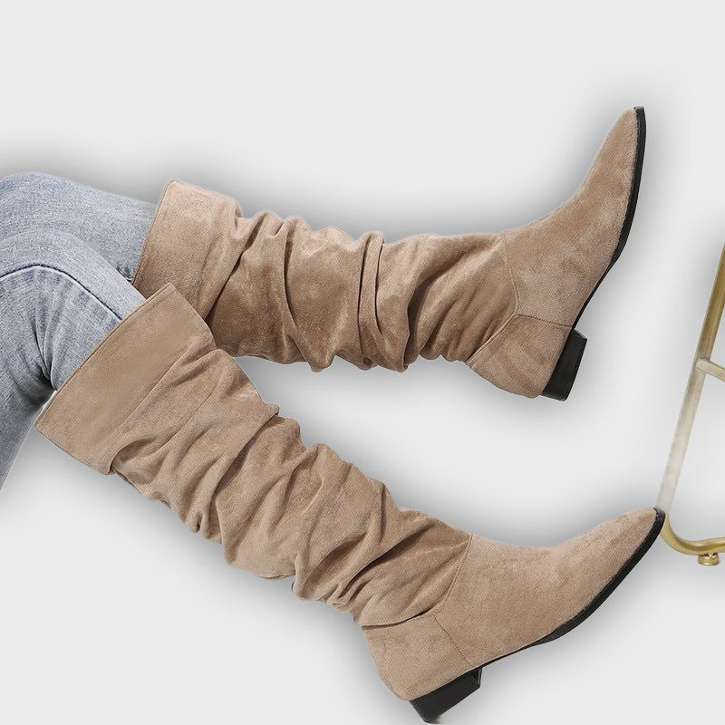 Leona – Women’s Knee-High Faux Suede Boots with Pointed Toe & Flat Sole