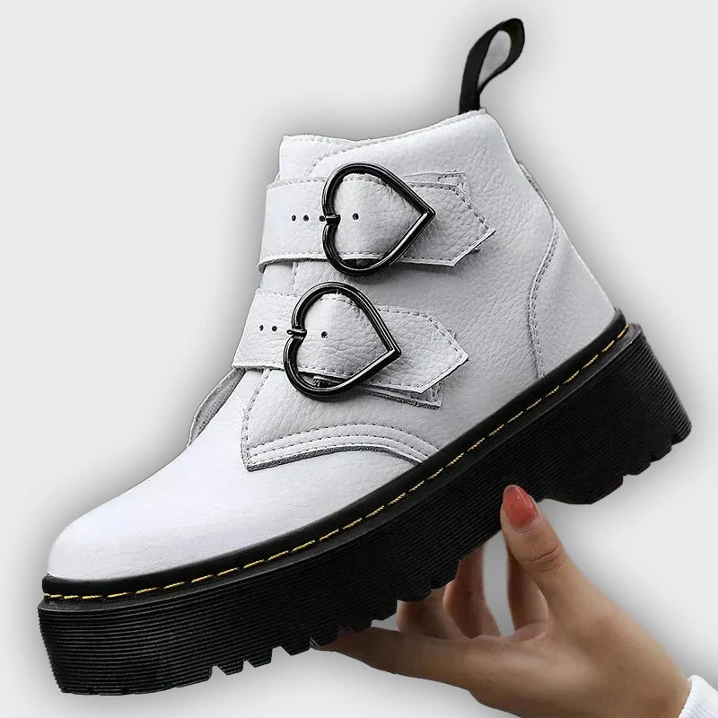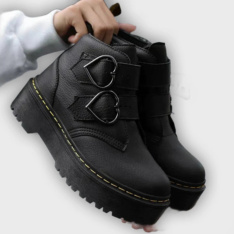 - ✔️ Style Keywords: chunky boots, edgy footwear, heart buckle boots, women’s ankle boots, bold style