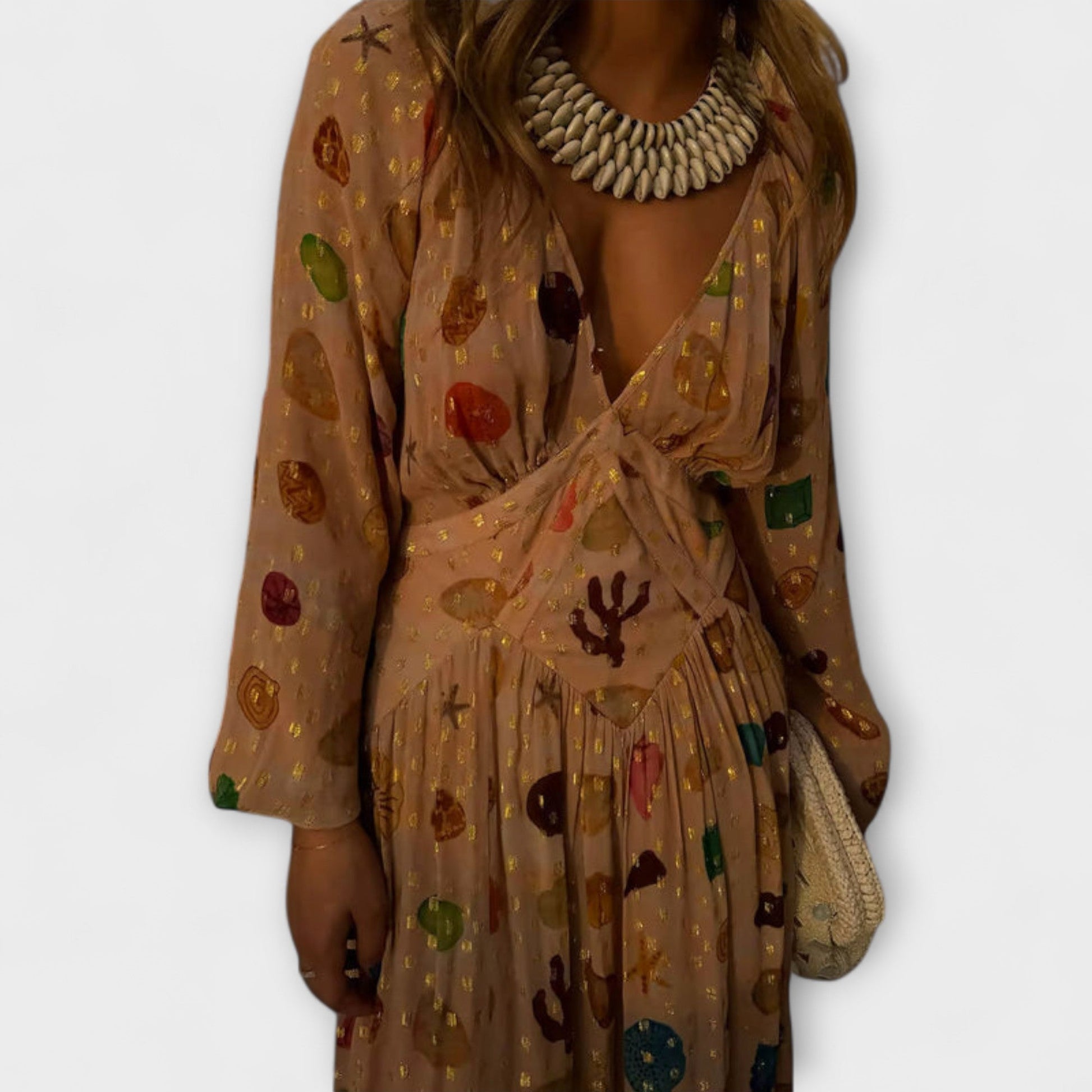 - Eye-Catching Design: Features a vibrant shell print adorned with exquisite gold accents, making it a standout choice for any occasion.